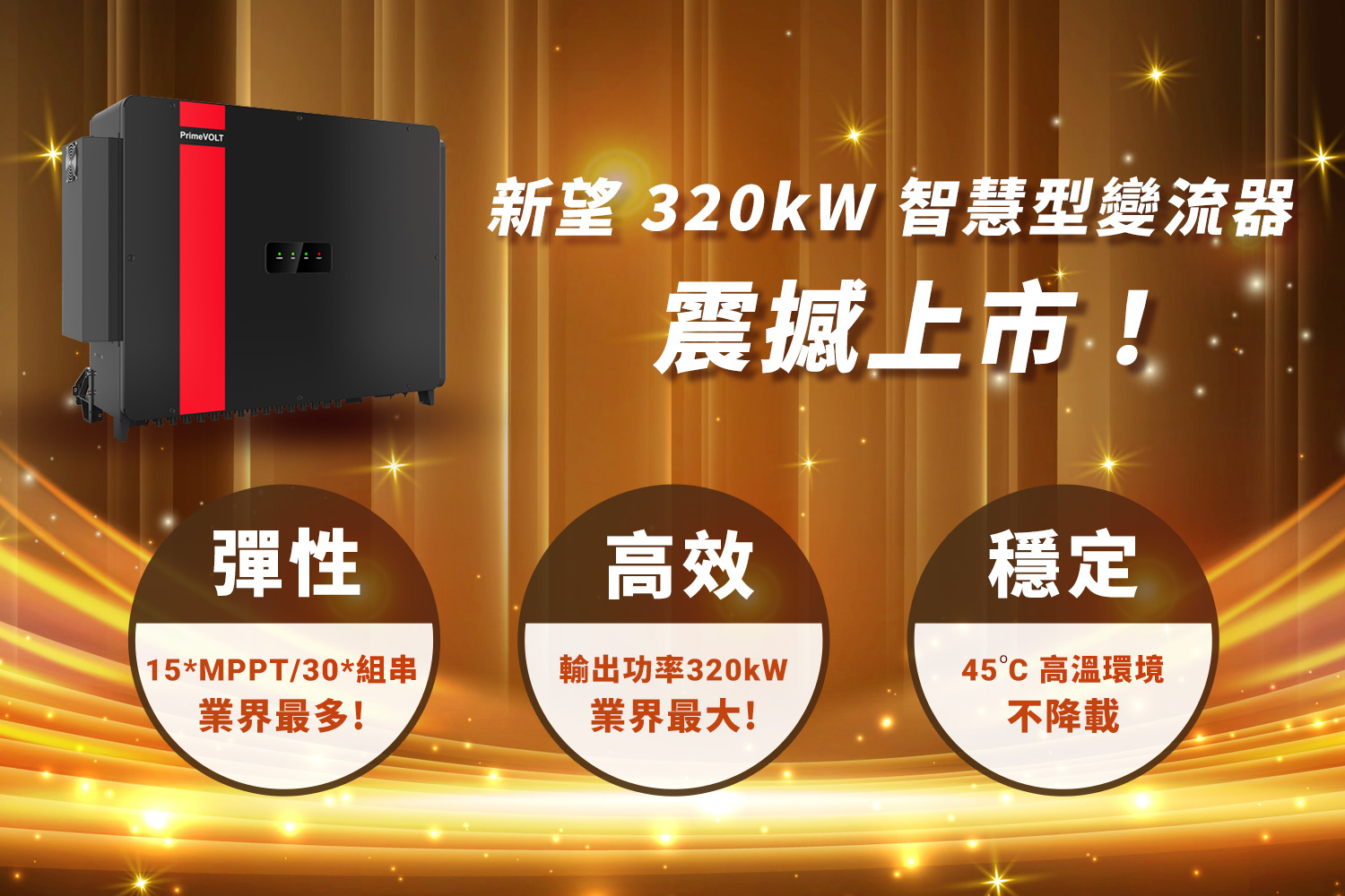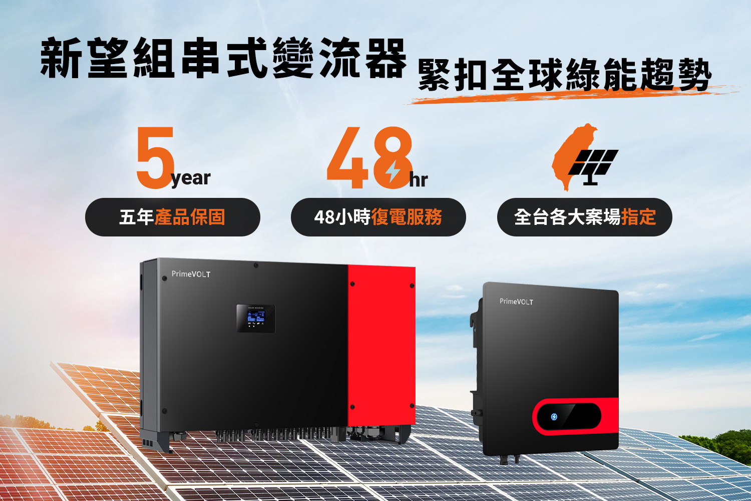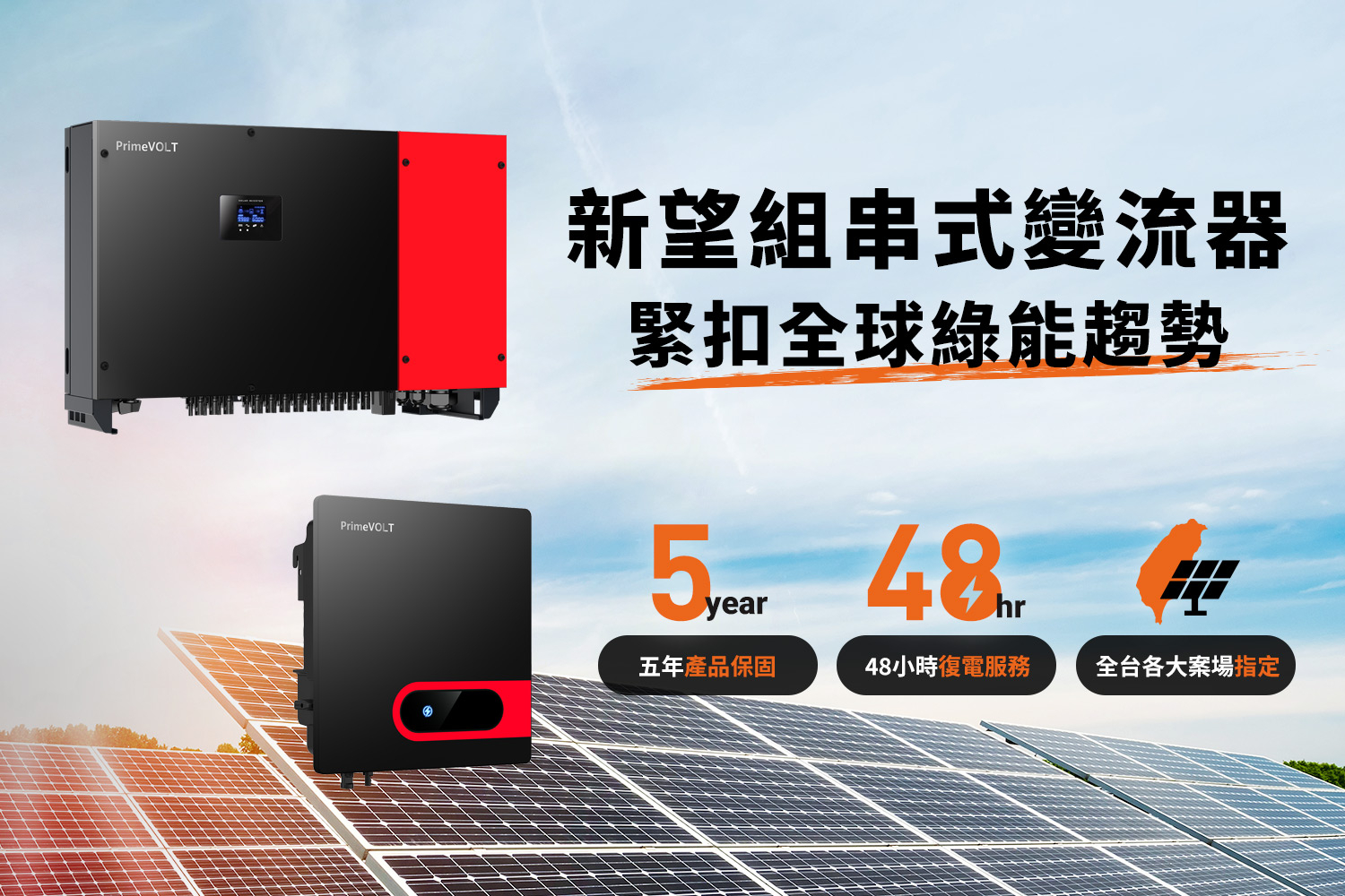 - 新望 PrimeVOLT 產品以太陽光電變流器(逆變器)為主,產品線包含單相 3-5 kW,三相 10-320 kW,新望於 2021~2025 連年榮獲經濟部「優質太陽光電產品金能獎」(Taiwan Excellent PV Award),為太陽能發電設備之首選。